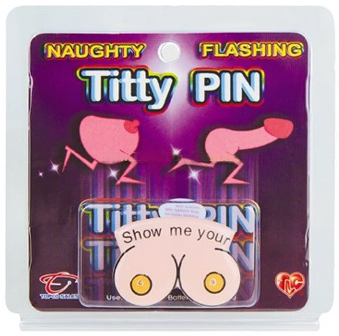 Представляем вашему вниманию значок – магнит Naughty Flashing Titty Pin, оформленный в виде груди, соски на которой мерцают веселыми огоньками.
