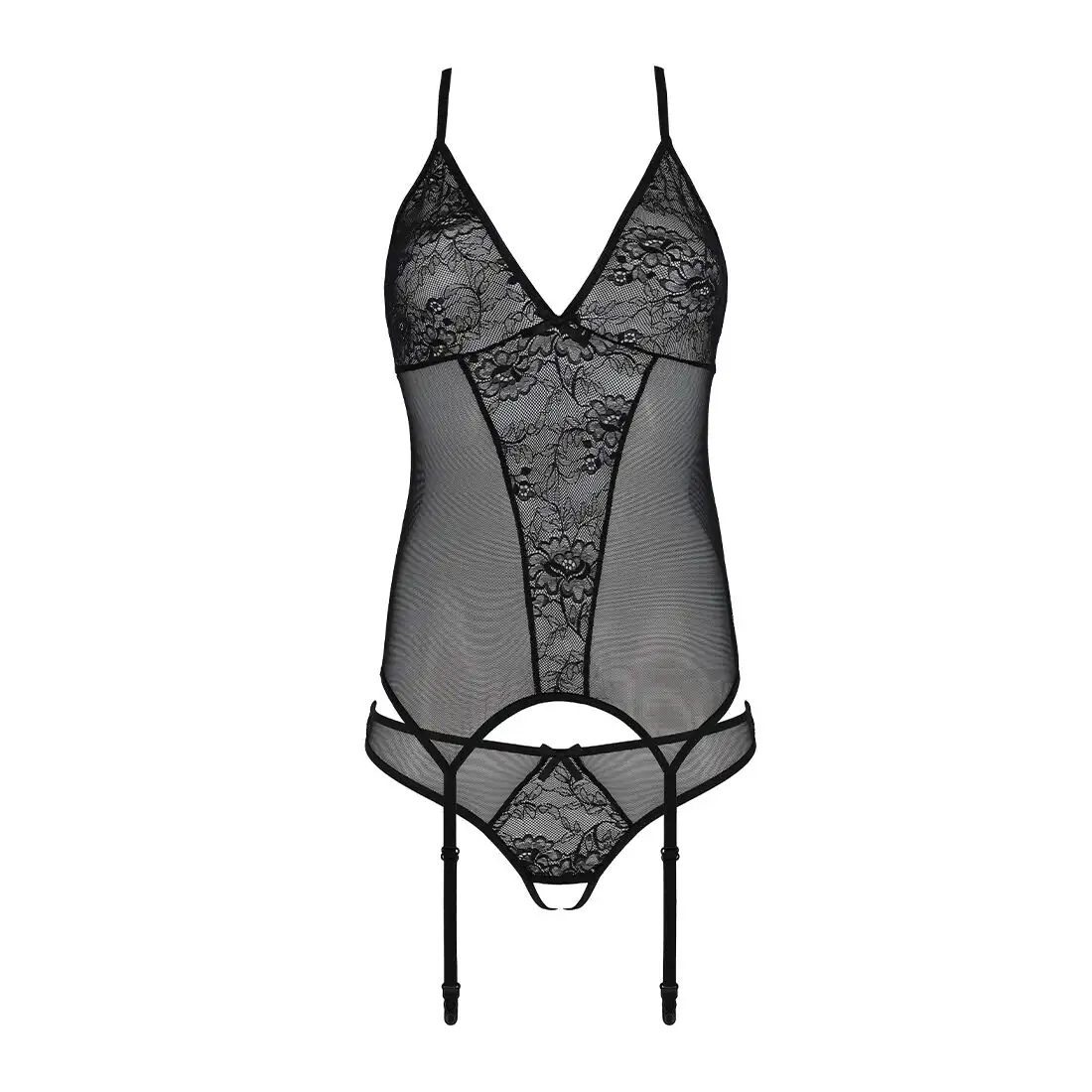 Корсет с пажами, трусики с ажурным декором и открытым шагом Ursula Corset black S/M — Passion