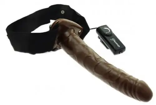 Страпон с вибратором CHOCOLATE DREAM HOLLOW STRAP ON. Имеет внешний пульт управления. Мультискоростной. Крепится при помощи эластичных ремешков. Длина фаллоимитатора - 24 см, диаметр - около 4.5 см.