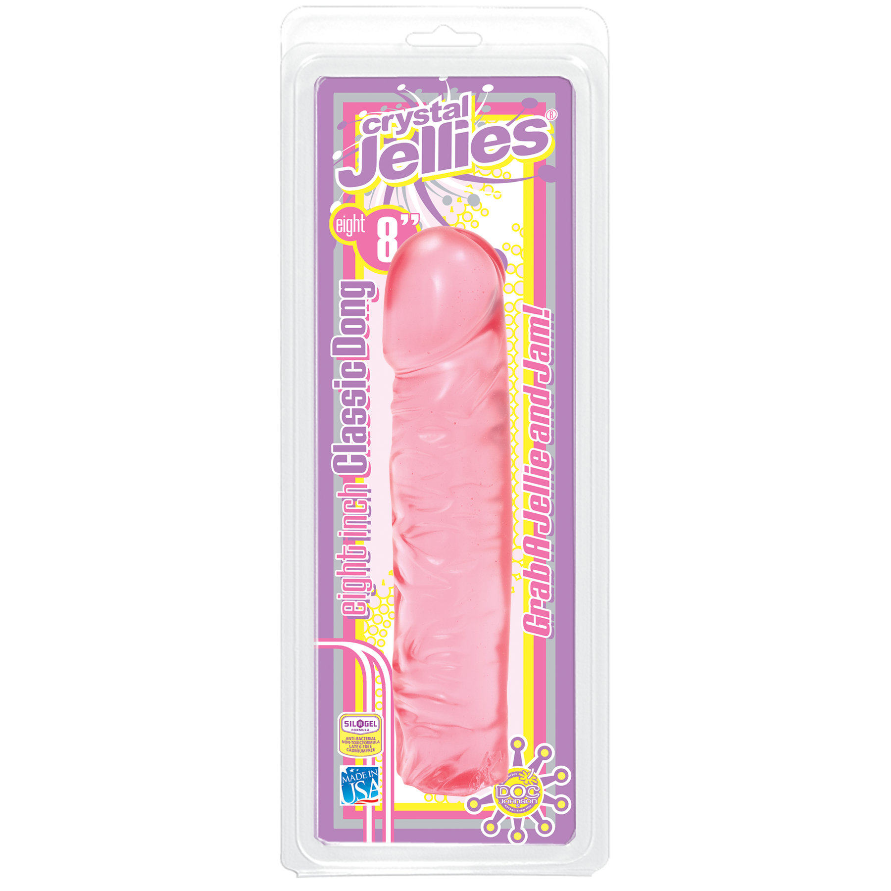 Сделан CRYSTALL JELLIES CLASSIC 8 PINK из поливинхрорида высочайшего качества с добавкой Sil-A-Gel – это запатентованный компонент производителя взрослых игрушек Doc Johnson, который не дает бактериям размножаться на поверхности фаллоса. Не содержит фталаты, латекс, бисфенол и прочие токсичные примеси.