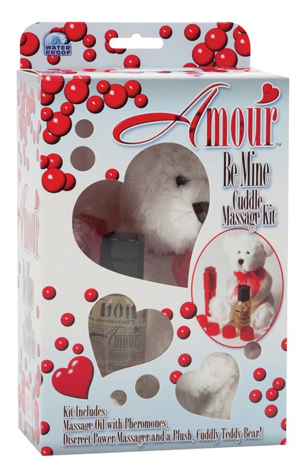Секс набор AMOUR BE MINE CUDDLE MASSAGE KIT. Оригинальный подарок своей второй половинке! В набор входят: мягкая игрушка, вибратор-массажер с 4 насадками, массажное масло с феромонами. Длина вибратора – 10 см, диаметр – 2,5 см. Питание: 1 батарейка АА (входит в комплект).