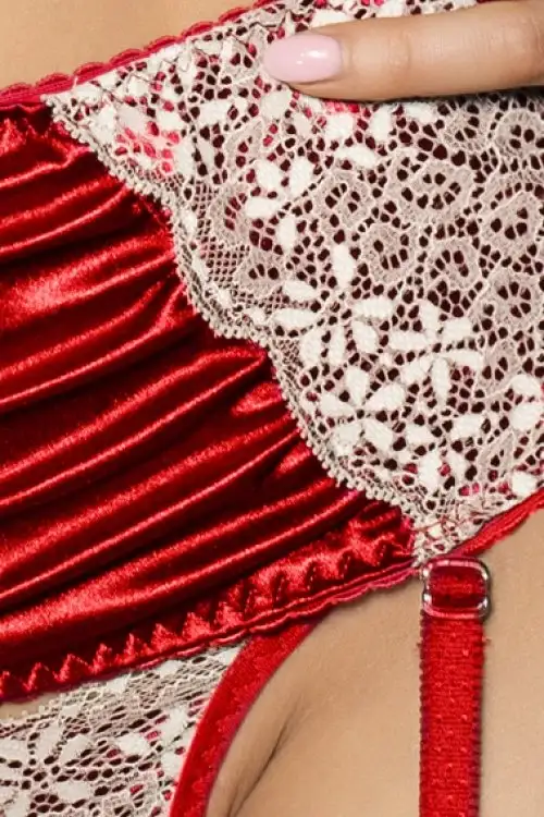 Комплект выгодно в себе соединил цвета страсти и невинности, красное и белое. Такая комбинация всегда смотрится выигрышно на женском теле. С помощью комплекта можно завоевать любого мужчину, подчеркнув пленительные черты. В комплект входит лиф, стринги с кружевной вставкой и широкий алый пояс из атласа. Бюст отлично приподнимает грудь и выгодно подчеркивает ее. Лиф не скрывает естественную красоту груди, а только манит поскорее прикоснуться к ней.