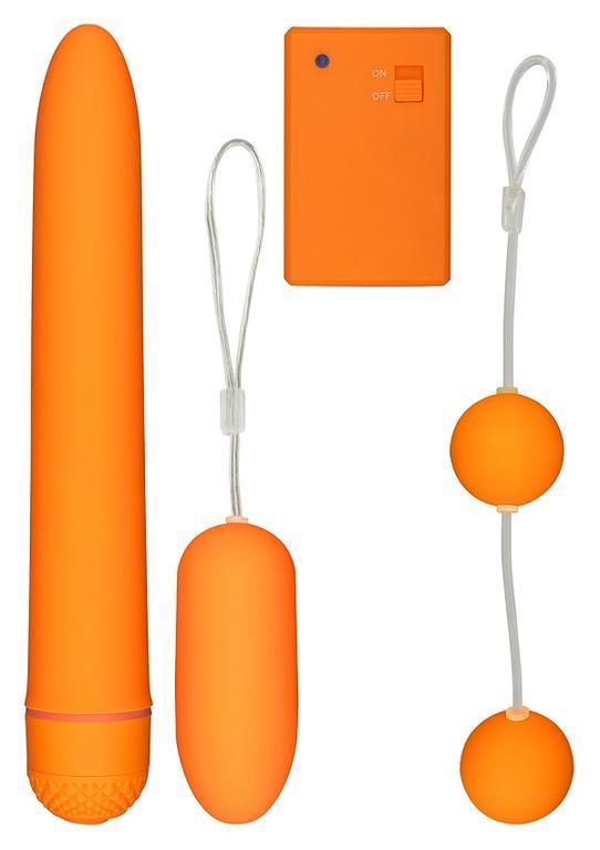 Секс-набор TOY JOY FUNKY FUN BOX ORANGE. В этот комплект входят вибратор, виброяйцо с внешним пультом управления, вагинальные шарики со смещенным центром тяжести. Длина вибратора – 18 см, диаметр – 3 см, длина виброяйца – 8 см, диаметр – 3,5 см. Питание – 2 батарейки, тип АА (вибратор), 2 батарейки, тип ААА (виброяйцо), 1 батарейка, тип 23A (ДУ пульт). Батарейки от вибратора и виброяйца в комплект не входят!
