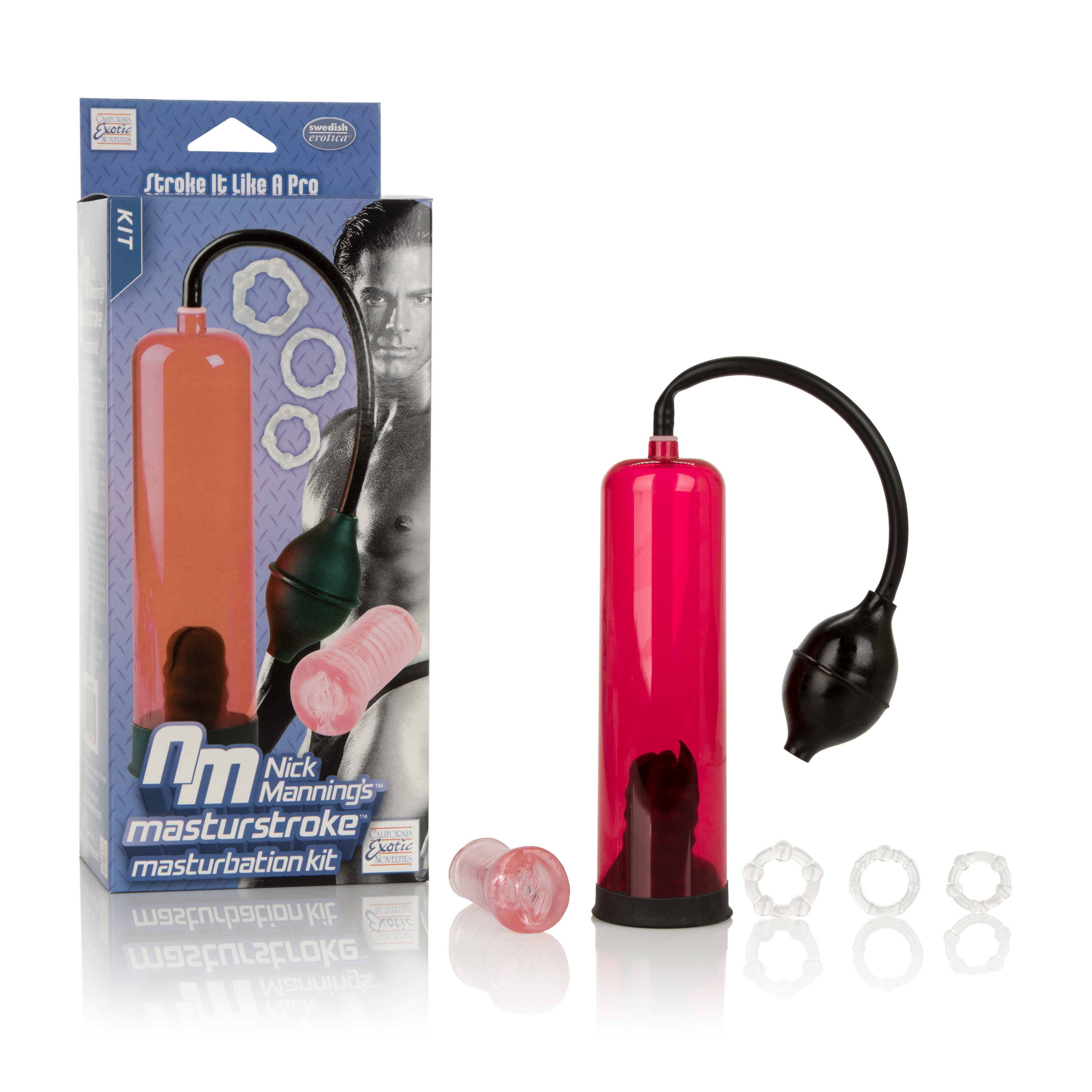 Секс набор NICK MANNING'S MASTURSTROKE от California Exotic Novelties. В набор входят: вакуумная помпа, мастурбатор Senso, три эрекционных кольца. Длина колбы – 22 см, длина мастурабтора – 7,5 см. Эрекционные кольца очень эластичные и подойдут на любой размер.