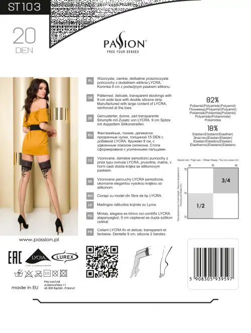 Желаете подчеркнуть красоту и изящество ножек? Устроить приятный сюрприз для партнера и завоевать сердце любимого мужчины? Тогда вам необходимы чулки ST103 1/2 beige – Passion от польского бренда. Шикарный и универсальный аксессуар хорошо сочетается с повседневной одеждой и вечерними платьями, костюмами для ролевой игры или кружевным бельем.