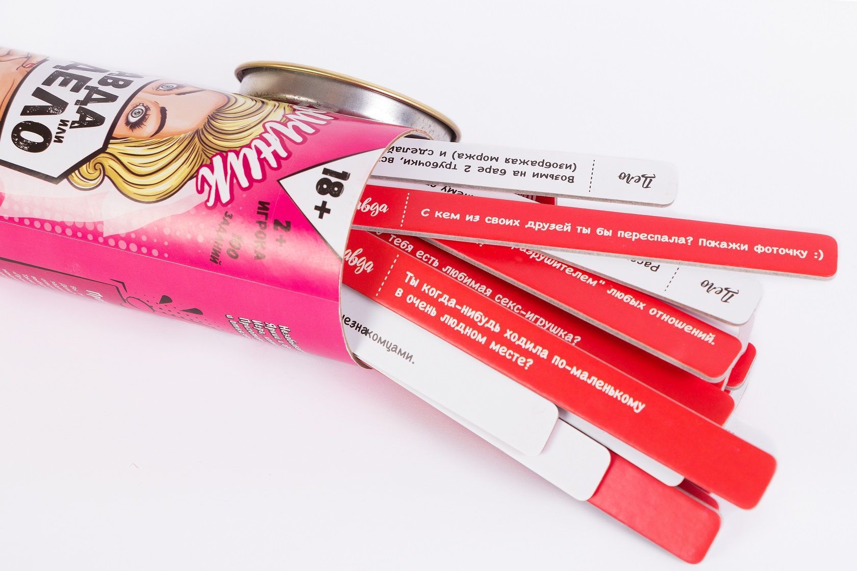Карточки выполнены из качественного плотного картона. Поэтому можете не переживать, что они испортятся по ходу игры. При этом вопросы окрашены в красный цвет и имеют пометку «правда». Различные задания (то есть, «дела») напечатаны на картоне белого цвета.