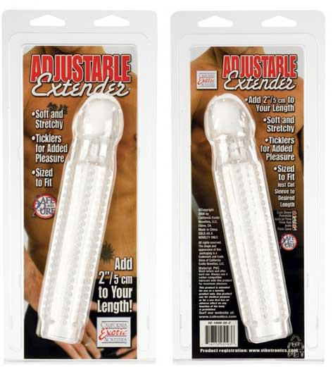 Удлиняющая насадка Adjustable. Изготовлена из эластичного, мягкого винила. Для дополнительной стимуляции имеет "шипы". Длина насадки - 21 см, диаметр - 3,5 см; Увеличивает длину пениса на 5 см.