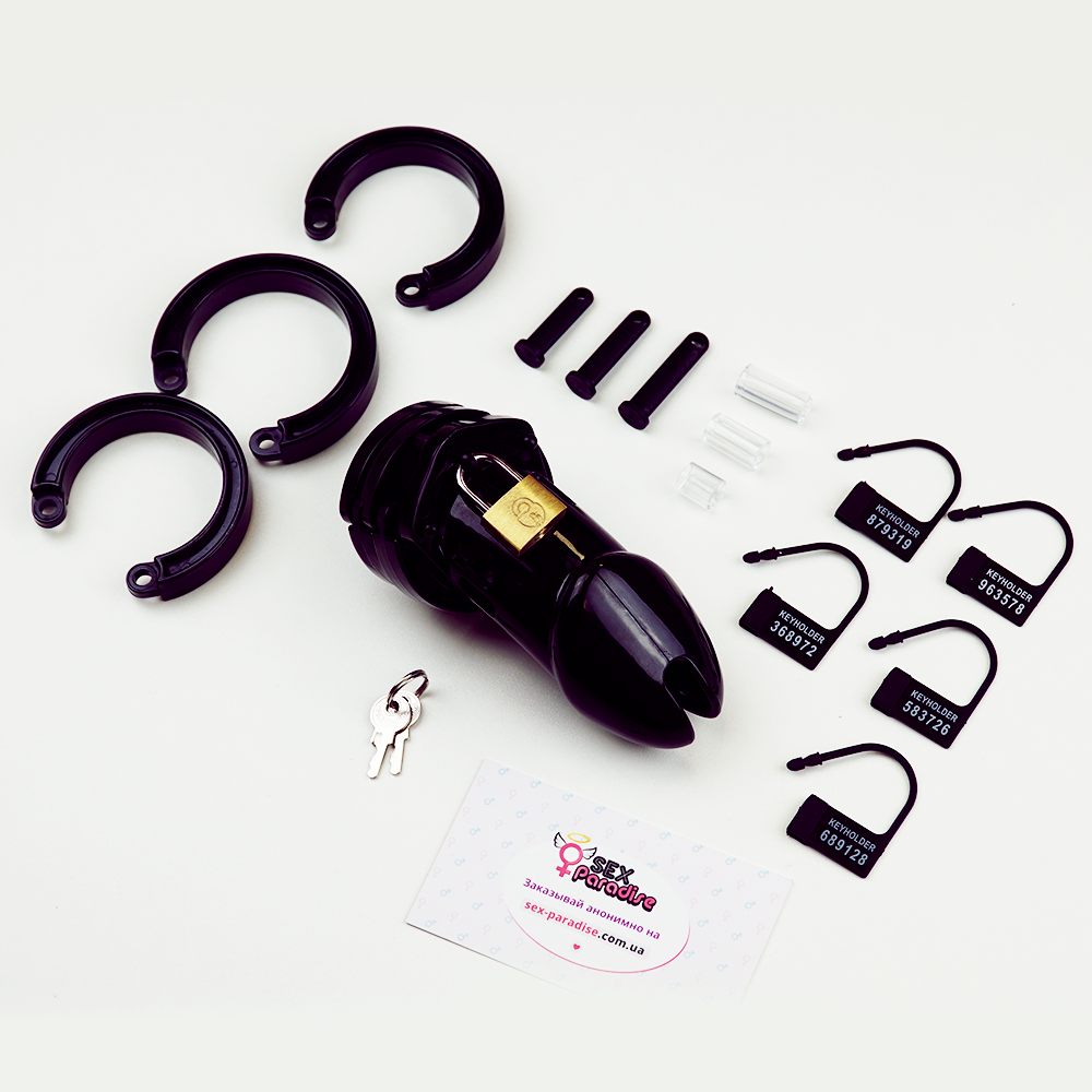 Игрушка в комплекте имеет 5 специальных колец и зажимов, благодаря которым можно регулировать диаметр и силу зажима исходя из ваших потребностей. Агрегат в комплекте имеет 2 ключа и медный замок. Простое устройство позволит сковать половой орган партнера, но при этом не доставит неприятных ощущений.