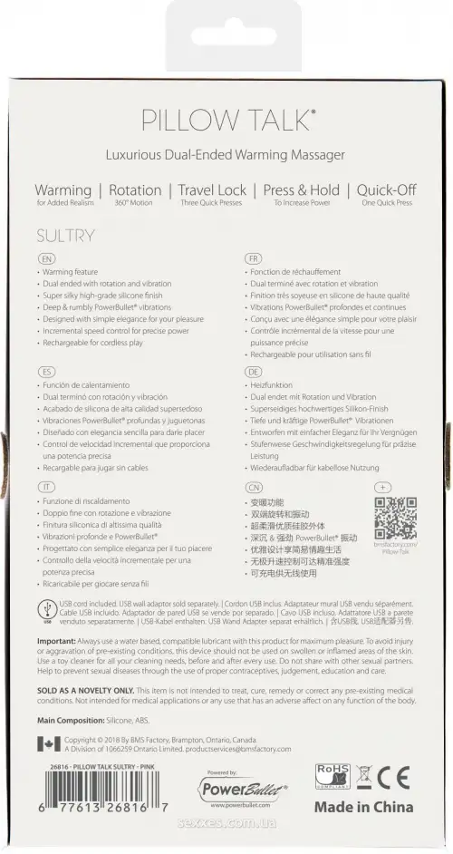 Pillow Talk - Sultry Vibrator Massager изготовлен из высококачественных материалов, безопасных для тела и легко чистящихся. Он имеет 10 режимов вибрации, поэтому вы можете найти идеальную настройку для своих нужд. Благодаря бесшумной работе он идеально подходит для незаметной игры или интимных моментов с вашим партнером. Кроме того, он заряжается от USB, так что вы всегда можете иметь его наготове, когда придет настроение!
