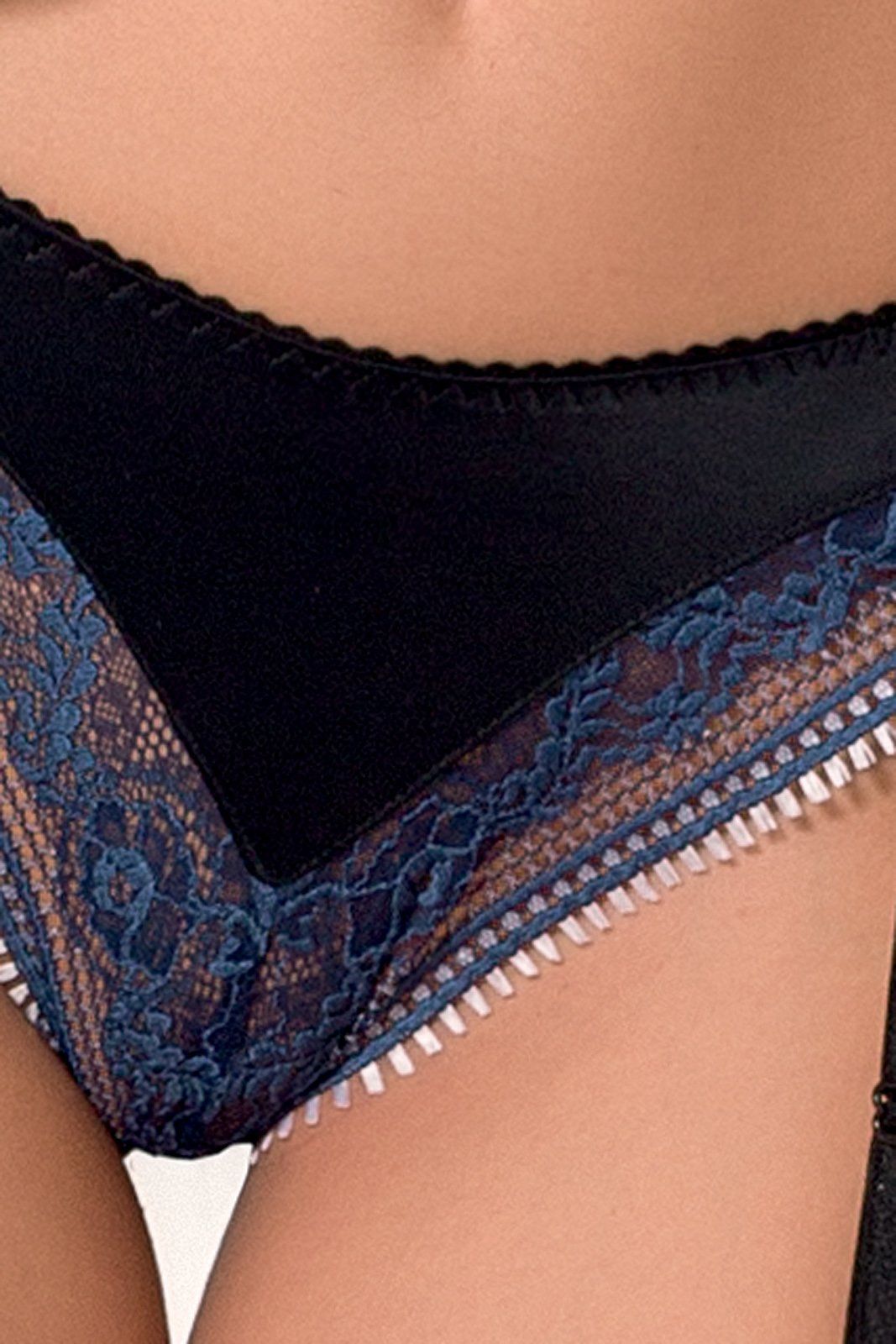 Набор включает трусики и лиф, сделанные из черного и синего тонкого кружева. Бюст с косточками отлично поддерживает грудь и делает на ней акцент. Одновременно с этим тонкий полупрозрачный материал нежно облегает кожу и очень приятно ощущается на теле. Эта модель белья – очень изящная и шикарная, она подчеркивает красоту женского тела и может использоваться для повседневной носки. Также можно докупить чулки, способные привлечь внимание к стройным и худым ножкам каждой женщины.
