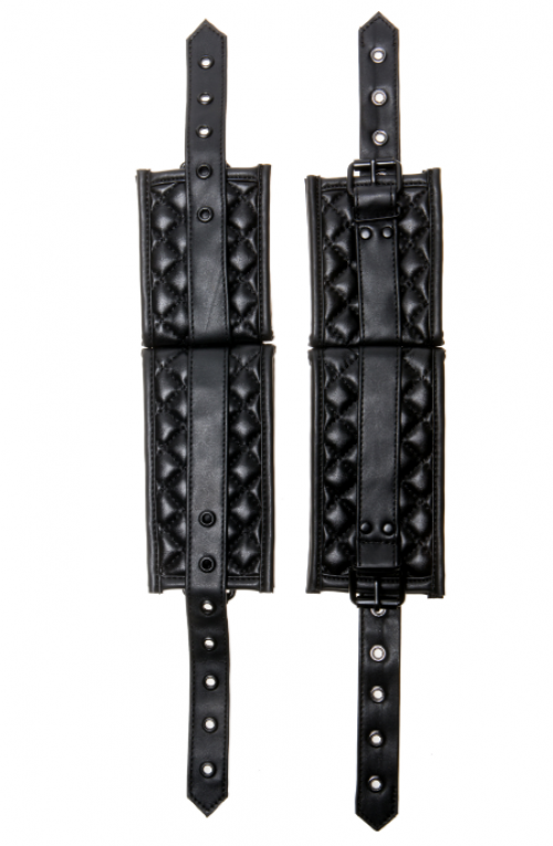 Специальные наручники и поножи обладают необычным стеганым рисунком, который придает оригинальный вид. В такой конструкции присутствуют ремни с пряжкой, что делает продукт универсальным. Изделия упаковываются в коробку с яркими деталями, благодаря чему такой комплект вы можете преподнести возлюбленной в качестве презента по торжественному случаю.