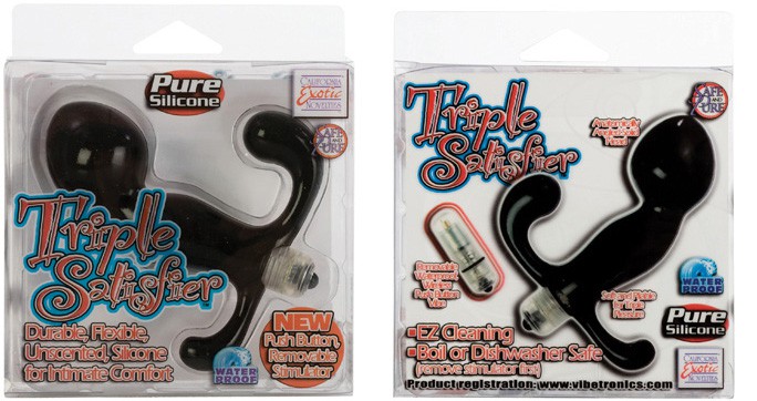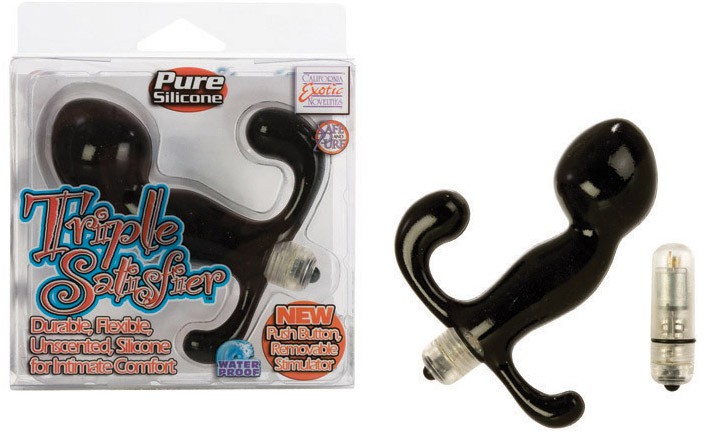 Вибратор тройной TRIPLE SATISFIER - стимуляция анальной, вагинальной и клиторальной эрогенных зон. Со съёмным вибростимулятором. Длина пробки - 10 см, ширина - 4 см. Длина стимулятора - 4 см, ширина - 2 см.
